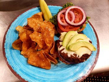 Burgers are 6oz Patties on a Roll with a Pickle Spear and a Side of Kettle Cooked Potato Chips